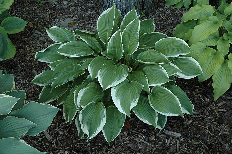 This variety displays good vigor, attractive mounded habit, and sun tolerance; lovely dark green leaves with an elegant white margin; provides beautiful texture and contrast to other plants; spikes of lavender flowers in mid-summer