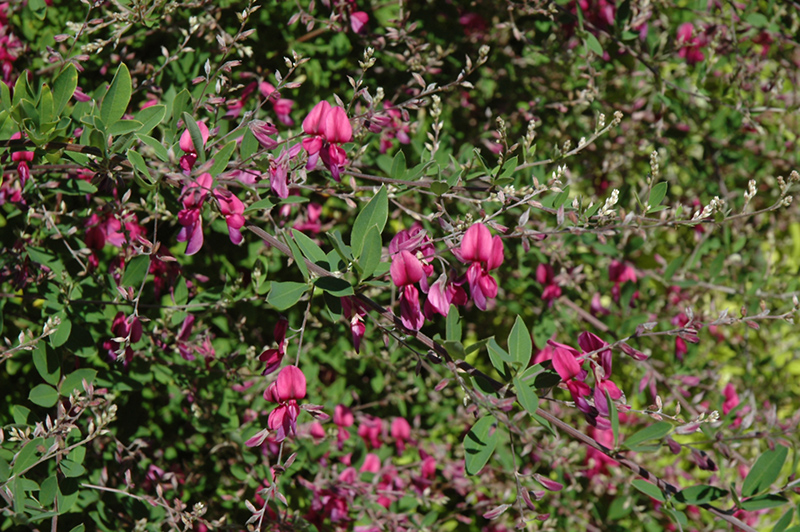 This compact shrub is covered with pink-purple pea-like flowers from summer to fall; dark green trifoliate leaves change to yellow in the fall