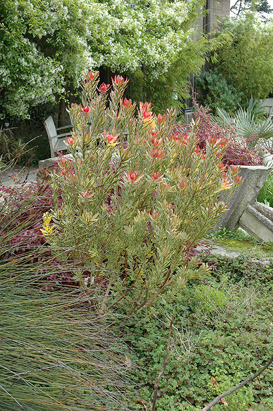 Safari Sunset Conebush is a multi-stemmed evergreen shrub with an upright spreading habit of growth. Its relatively fine texture sets it apart from other landscape plants with less refined foliage.