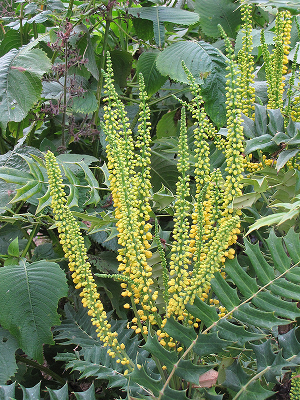 Interesting dark green foliage resembles holly leaves; the spiny leaves are held on long branches giving this upright shrub fabulous texture ; treasured for its bold clusters of bright yellow flowers ; does best where it will receive some snow cover