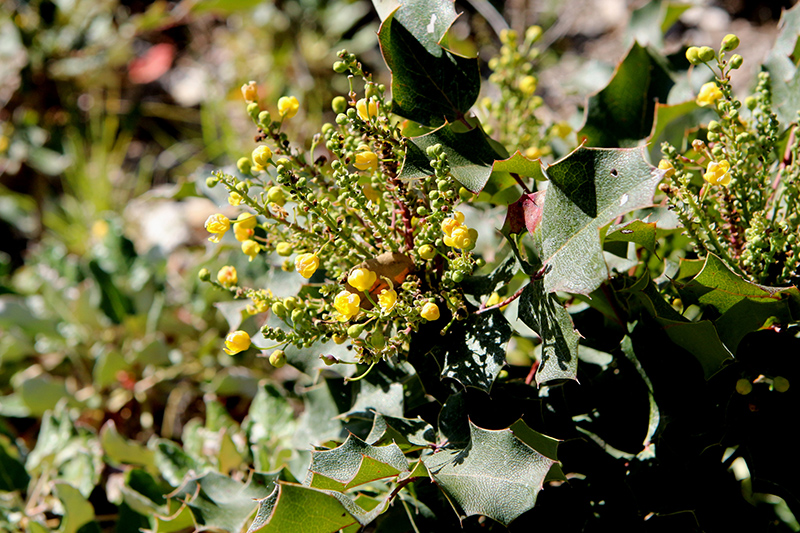 This relatively rare native shrub has lustrous dark green foliage resembling the spiny leaves of a holly; also reasured for its bold clusters of bright yellow flowers and light blue edible berries; plant it where it will receive some snow cover