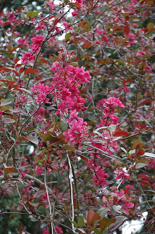 Spectacular rose-purple blooms cover broadly sweeping branches in springtime; young leaves, stems and wood are purplish-red; the striking dark red fruit attracts birds