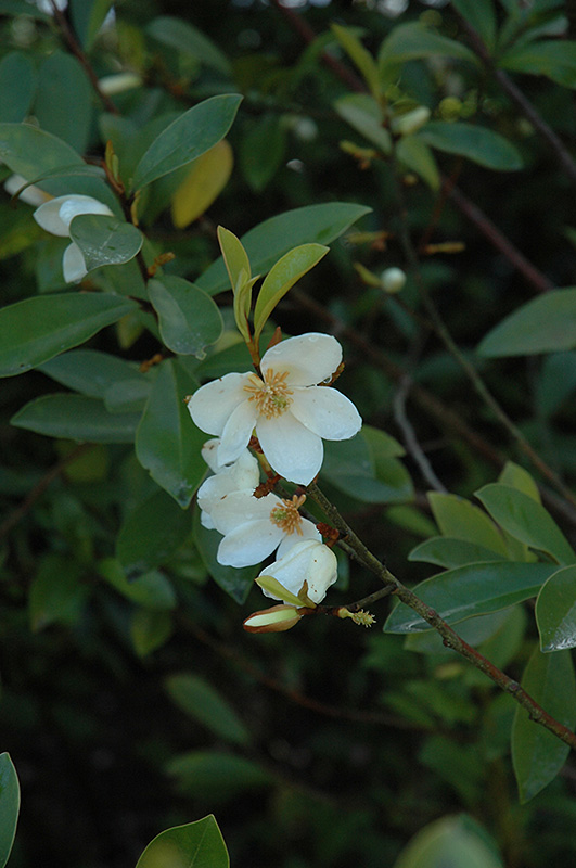 Port Wine Magnolia features showy lightly-scented creamy white flowers along the branches in mid spring. It has dark green evergreen foliage. The glossy pointy leaves remain dark green throughout the winter.