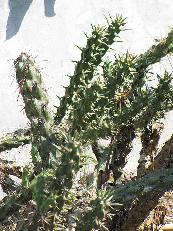 Santa Fe Cholla Cactus is a succulent evergreen plant with a spreading habit of growth that trails along the ground. It commonly grows as a shrub-like plant with multiple 'branches' and stems. As a type of cactus, it has no true foliage; the body of the plant is wholly comprised of a linked series of spiny grayish green narrow cylindrical segments which are connected together to form the branches of the plant. With age, this plant will eventually develop a woody khaki (brownish-green) 'trunk' at its base.