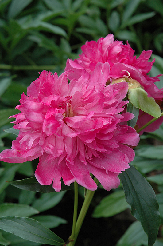 Bold and beautiful double fuchsia blooms flower in midsummer; the fragrant blooms are heavy and require staking