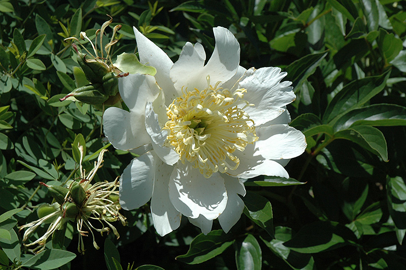 Bu-Te Peony features bold fragrant white flowers with yellow eyes at the ends of the stems from late spring to early summer. The flowers are excellent for cutting. Its compound leaves emerge burgundy in spring, turning green in colour throughout the season.