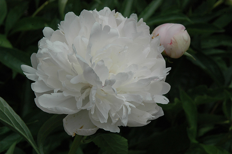 Pure white double flowers sometimes tinged with red; not a strong performer