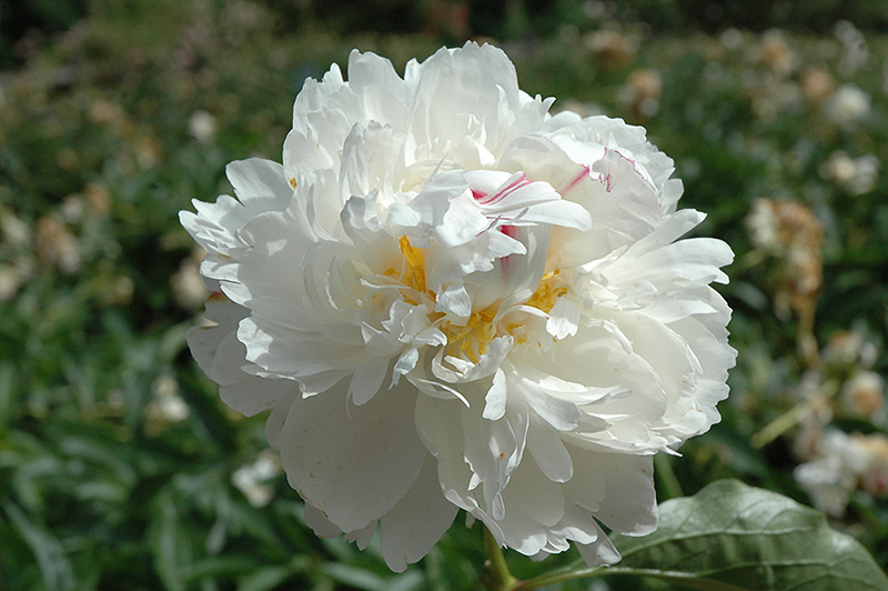 A strong double white selection with light pink blush and subtly laced with red edges; strong stems and heavy foliage; light fragrance