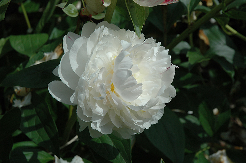 Large, double white flowers with blush; the center is tinged with yellow; stout stems and subtle fragrance; not entirely a reliable bloomer