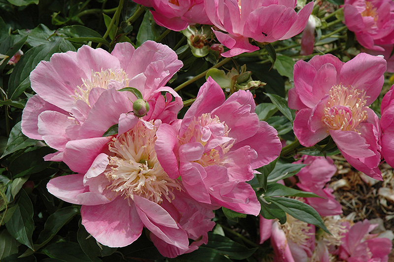 Largo Peony will grow to be about 24 inches tall at maturity, with a spread of 3 feet. When grown in masses or used as a bedding plant, individual plants should be spaced approximately 30 inches apart. The flower stalks can be weak and so it may require staking in exposed sites or excessively rich soils. It grows at a slow rate, and under ideal conditions can be expected to live for approximately 20 years. As an herbaceous perennial, this plant will usually die back to the crown each winter, and will regrow from the base each spring. Be careful not to disturb the crown in late winter when it may not be readily seen!