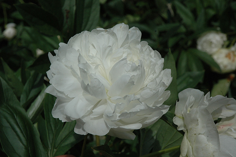 This early double peony is ivory white when it opens then matures to pure white; the blooms are compact and beautifully shaped; its large flowers are mildly fragrant and fairly abundant