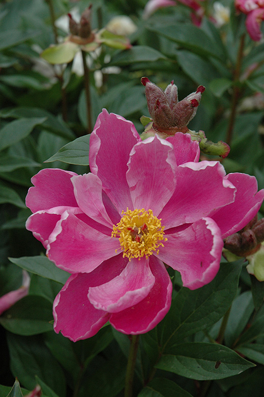 L'Etincelante Peony will grow to be about 28 inches tall at maturity, with a spread of 3 feet. When grown in masses or used as a bedding plant, individual plants should be spaced approximately 30 inches apart. The flower stalks can be weak and so it may require staking in exposed sites or excessively rich soils. It grows at a slow rate, and under ideal conditions can be expected to live for approximately 20 years. As an herbaceous perennial, this plant will usually die back to the crown each winter, and will regrow from the base each spring. Be careful not to disturb the crown in late winter when it may not be readily seen!