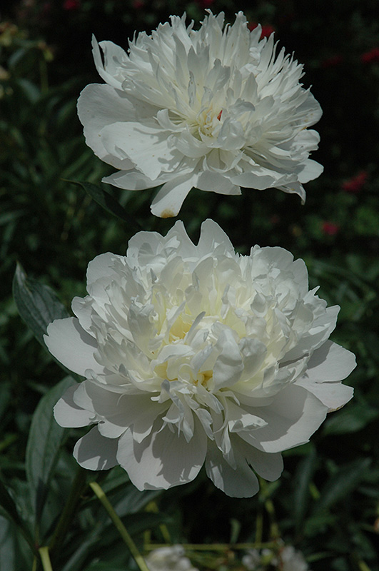 Madame Savreau Peony will grow to be about 24 inches tall at maturity extending to 3 feet tall with the flowers, with a spread of 3 feet. When grown in masses or used as a bedding plant, individual plants should be spaced approximately 30 inches apart. The flower stalks can be weak and so it may require staking in exposed sites or excessively rich soils. It grows at a slow rate, and under ideal conditions can be expected to live for approximately 20 years. As an herbaceous perennial, this plant will usually die back to the crown each winter, and will regrow from the base each spring. Be careful not to disturb the crown in late winter when it may not be readily seen!