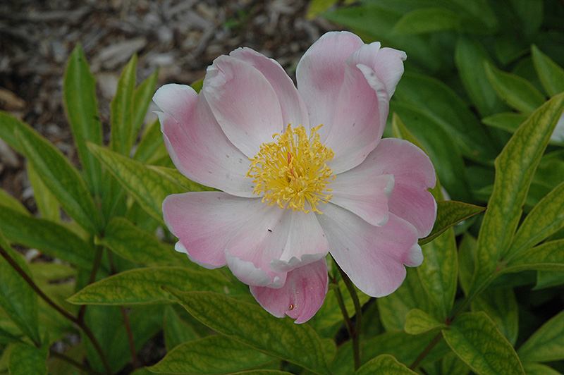 Mischief Peony will grow to be about 24 inches tall at maturity extending to 3 feet tall with the flowers, with a spread of 3 feet. When grown in masses or used as a bedding plant, individual plants should be spaced approximately 30 inches apart. The flower stalks can be weak and so it may require staking in exposed sites or excessively rich soils. It grows at a slow rate, and under ideal conditions can be expected to live for approximately 20 years. As an herbaceous perennial, this plant will usually die back to the crown each winter, and will regrow from the base each spring. Be careful not to disturb the crown in late winter when it may not be readily seen!