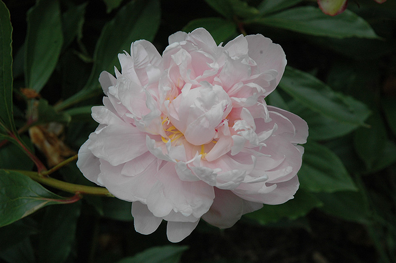 Double peony with large, light rose-pink flowers that pale with age, buried gold stamens and crimson streaks; fragrance is strong and fresh; blooms in midseason; abundant flowers held on stiff stems