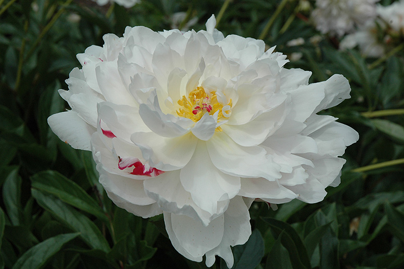 Triomphe de L'Exposition de Lille Peony features bold lightly-scented double rose flowers with yellow centers at the ends of the stems in early summer. The flowers are excellent for cutting. Its compound leaves emerge burgundy in spring, turning green in colour throughout the season.