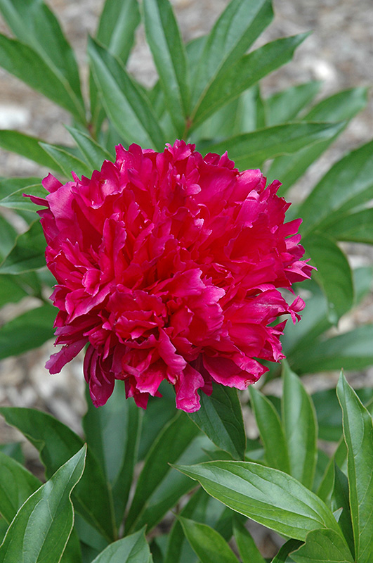 Gloire de Touraine Peony will grow to be about 30 inches tall at maturity, with a spread of 3 feet. When grown in masses or used as a bedding plant, individual plants should be spaced approximately 30 inches apart. The flower stalks can be weak and so it may require staking in exposed sites or excessively rich soils. It grows at a slow rate, and under ideal conditions can be expected to live for approximately 20 years. As an herbaceous perennial, this plant will usually die back to the crown each winter, and will regrow from the base each spring. Be careful not to disturb the crown in late winter when it may not be readily seen!