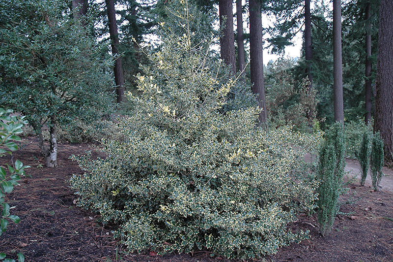 A stunning male variety of holly with extreme cream variegation on the spiny leaves, especially around the edges of the plant, makes a commanding accent plant or hedge; doesn't produce berries