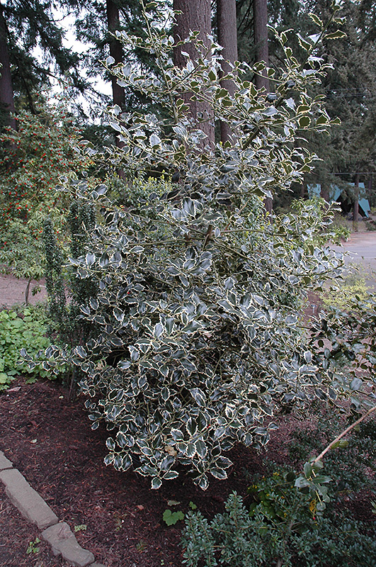 A stunning holly characterized by the colorful white-variegated glossy leaves which are quite spiny; a vigorous grower, ideal for mass planting and natural screening; the berries contrast nicely with the foliage for a breathtaking display in winter