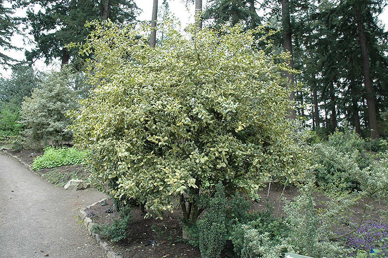 A rare variety with oddly shaped white-variegated foliage, highly glossy and interestingly spiked, also nice red berries throughout the winter; can grow quite large, ideal for massing or screening where a small broad tree is called for