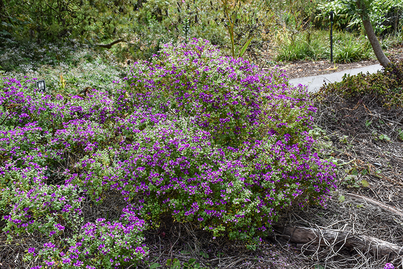 A pretty upward growing shrub with evergreen boxwood-like foliage; vivid purple winged flowers with a whitish crest almost year round; cut flowers are long lasting in arrangements; coastal plant great for beachside plantings