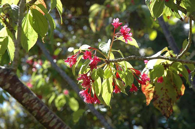 Taiwan Cherry is bathed in stunning clusters of lightly-scented hot pink bell-shaped flowers along the branches in early spring before the leaves. The fruits are showy dark red drupes which fade to black over time, which are carried in abundance in early summer. It has dark green deciduous foliage which emerges coppery-bronze in spring. The pointy leaves turn an outstanding coppery-bronze in the fall. The smooth brick red bark adds an interesting dimension to the landscape.