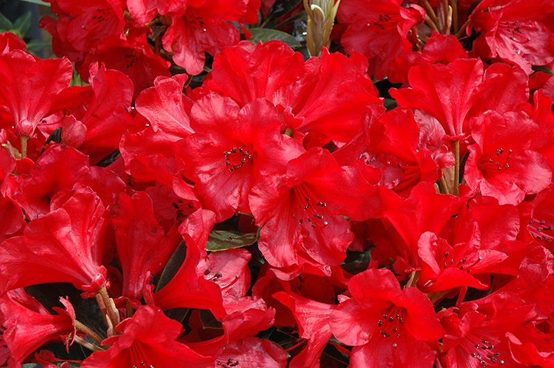 Jean Marie de Montague Rhododendron is covered in stunning clusters of red trumpet-shaped flowers at the ends of the branches in mid spring. It has dark green evergreen foliage. The narrow leaves remain dark green throughout the winter.