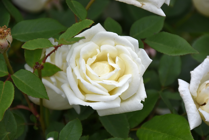 A lovely china rose variety with very round buds opening into a delicate swirl of small ivory blooms that are very fragrant; a good selection for containers or small garden accent; blooms repeatedly throughout the season